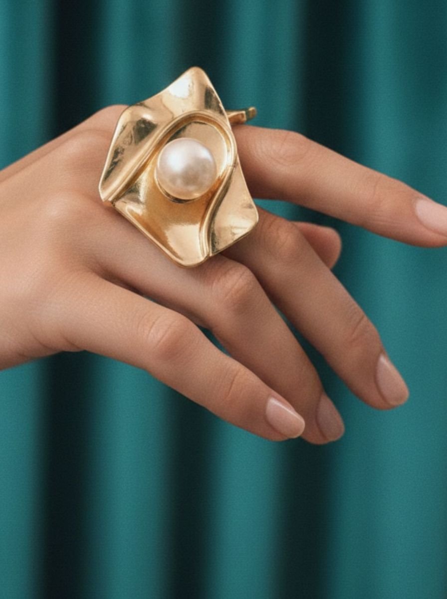 Add a touch of luxury and elegance to your jewelry collection with this stunning gold-plated pearl statement ring. Designed with a unique artistic shape and a beautiful pearl centerpiece, this ring perfectly blends modern fashion with timeless sophistication.