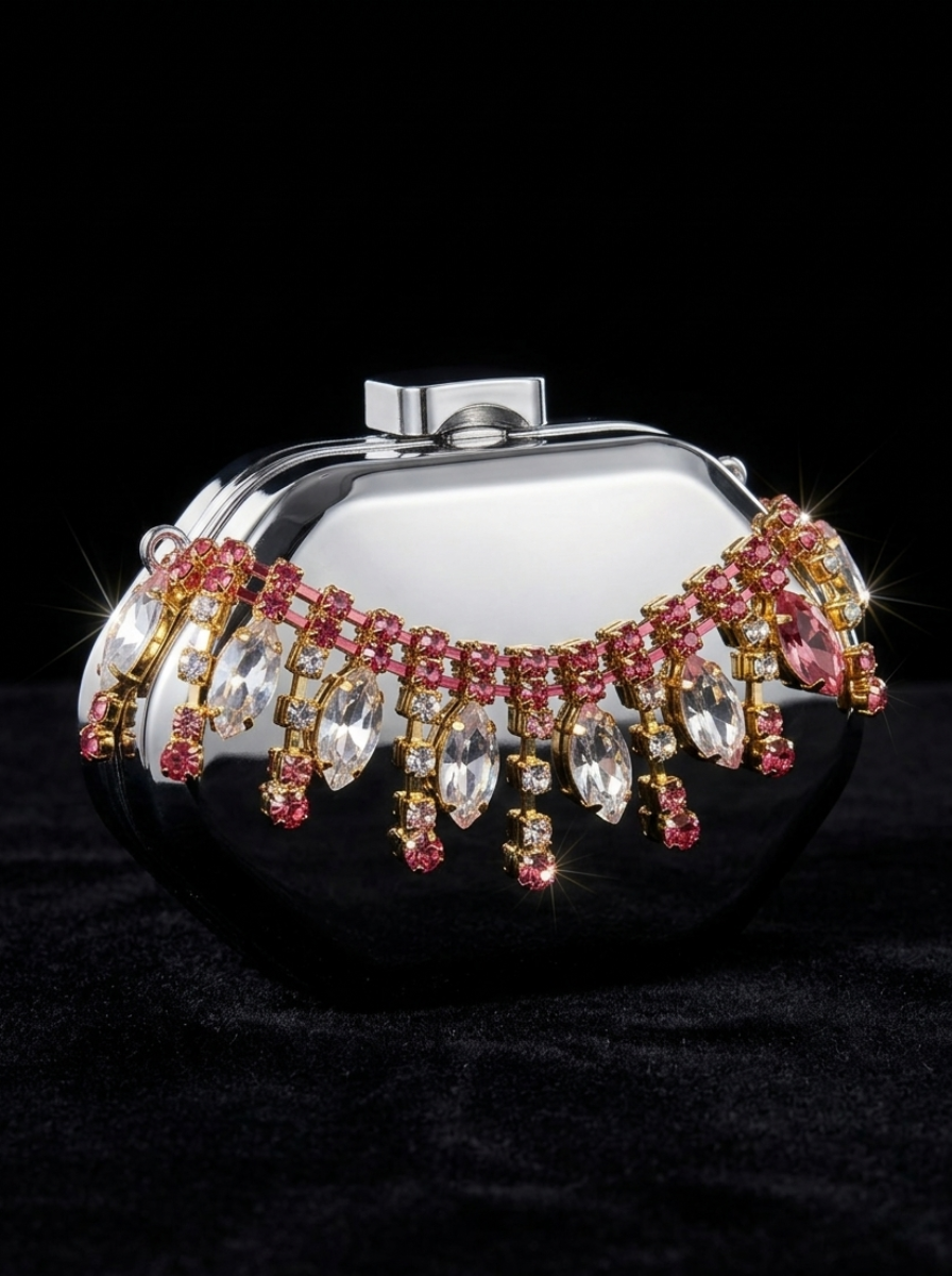 • Jeweled Fringe Detail: Features a draped “necklace” of hand-set crystals, including marquise-cut clear stones and shimmering rose-pink accents set in a gold-tone frame.